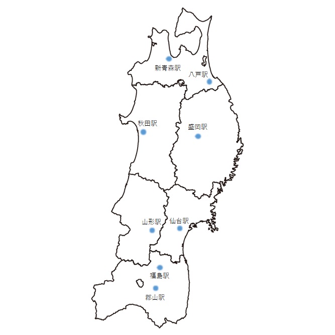 画像:東北のフラッグなど掲載駅とフラッグデザイン例(駅により縦横比など若干異なります。)