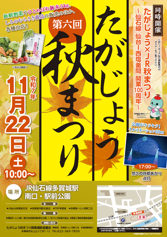 令和7年11月22日(土曜日)に多賀城の秋のイベント「たがじょう市民市」「ふれあいフェスティバル2025」「悠久の詩都あかり2025」「しろのむらさき10周年記念フェア」がJR仙石線多賀城駅前で一堂に会して同日開催されます。