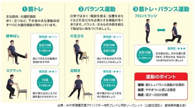 - 下肢筋力トレーニング(片足立ち、スクワットなど)