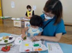 テーマは「野菜に触れて、楽しもう!野菜スタンプ」として、実際に身近な野菜に触れ、手先を使って制作に取り組み、親子で楽しく取り組みました。
