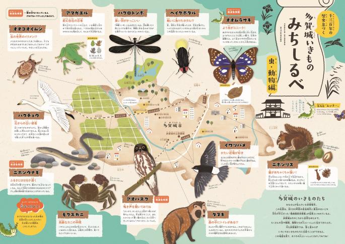 この「千三百年の歴史息づく 多賀城いきものみちしるべ」は子どもたちを中心とする多くの方々に、これらの多賀城に生きるいきものたちに関心を持ってもらうこと、いきものたちに関わる和歌や絵本などに興味を持ってもらうことを通して、受け継がれてきた多賀城の自然やそれを守ろうとする人々の思いや行動を、千年先の未来につないでいくキッカケとして植物編と虫・動物編の2種類の、未知を知る術(みちをしるすべ)となる読み物を作成しました。